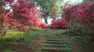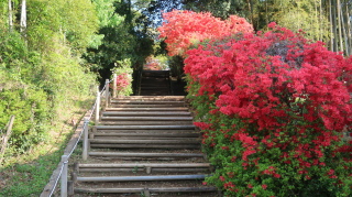 第1ゲートから山裾の階段上り続く。両側に植えられたツツジの古木は見頃を迎えている。 |