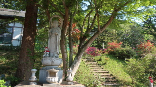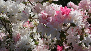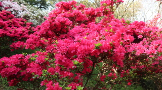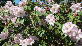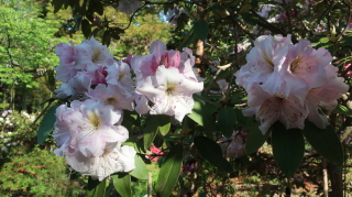 階段をしばらく上ったところにある正福寺の庭園に、満開のシャクナゲが咲き誇っている。かなりの大株で、見事な薄桃色の花をいっぱい付けている。 |