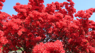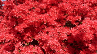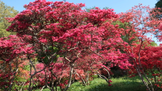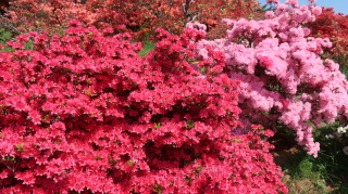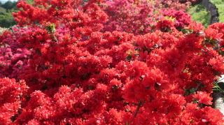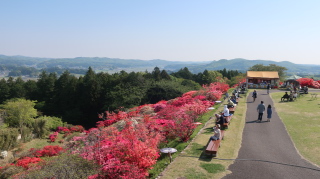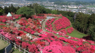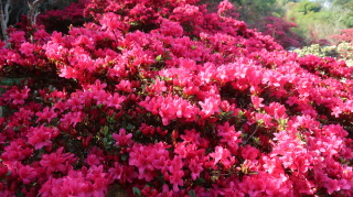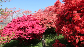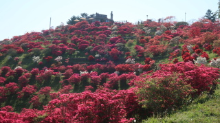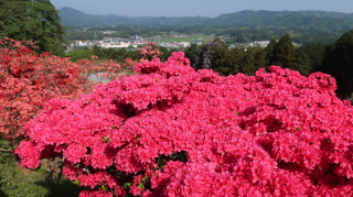 山頂(143m)の斜面に25品種約8500株のつつじが植えられている。ホンキリシマツツジやヒノデツツジの鮮やかな赤色や桃色が山裾を彩っている。 |