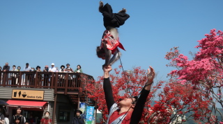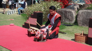 伝統芸の猿回しアトラクションがあり、見物客の輪ができる。見事な芸に拍手喝采鳴りやまず。 |