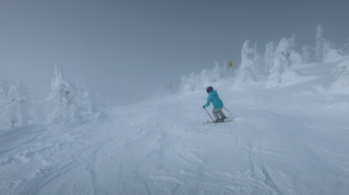 二日目、早朝は前日のような雲に覆われるが、僅かに空が明るくなっている。リフトを乗り継ぎ、山頂ロープウェイに乗り込む。山頂レストランでコーヒーブレイクし、窓越しに樹氷を確認する。なぜか樹氷は疎らで細っている。後でその意外な原因を知ることになる。 |